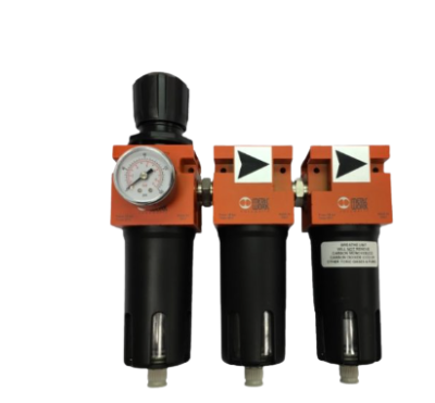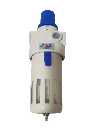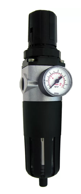 É um equipamento compacto de tratamento do ar, formado por um filtro de ar e um regulador de pressão. O filtro elimina impurezas sólidas e condensados presentes no fluxo de ar, já o regulador de pressão garante a redução e a estabilidade da pressão, destinada a alimentação de máquinas, dispositivos, ferramentas, etc. Disponível na bitola de 1/2” BSP, pode receber reduções para 3/8” e 1/4″ BSP ou ainda ampliado para 3/4″ BSP. Deve ser montado na posição vertical e pode ser equipado com dreno automático ou semiautomático. O copo deve ser limpo periodicamente e lavado com água e sabão neutro (nunca utilizar solventes).