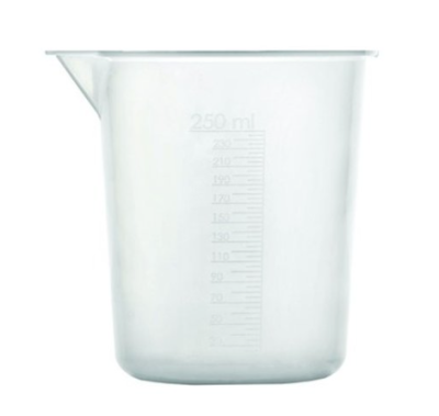 Copo graduado em Polipropileno transparente com bico vertedor, graduação em alto relevo;