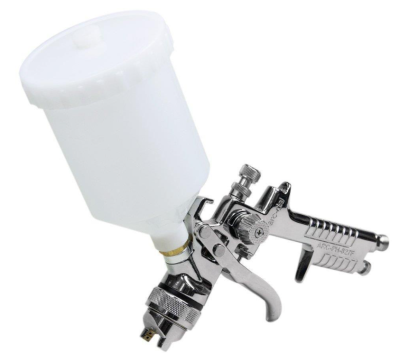 Pistola HVLP para uso geral, com o melhor custo-benefício, amplamente utilizada para a repintura de veículos. Inclui válvula de ajuste e caneca de plástico de gravidade de 600 ml.