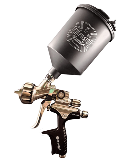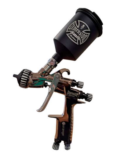 A Pistola de Pintura Clear Gold tem a assinatura da oficina de pintura automotiva Dimension Customs em parceria com a Orange. Com bico raiado de 1.3 ela é ideal para aplicação de verniz.