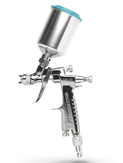 Pistola HVLP para uso geral, com o melhor custo-benefício, amplamente utilizada para a repintura de veículos. Inclui válvula de ajuste e caneca de plástico de gravidade de 600 ml.