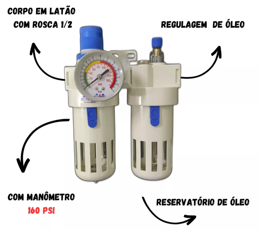 Filtro de ar com regulador de pressão e manômetro, permite retirar material particulado através do filtro e possibilita separação do condensado para redução da umidade do ar. Conta com sistema de drenagem semi automática que abre automaticamente abaixo de 25psi.