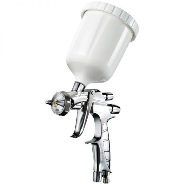 Pistola HVLP para uso geral, com o melhor custo-benefício, amplamente utilizada para a repintura de veículos. Inclui válvula de ajuste e caneca de plástico de gravidade de 600 ml.